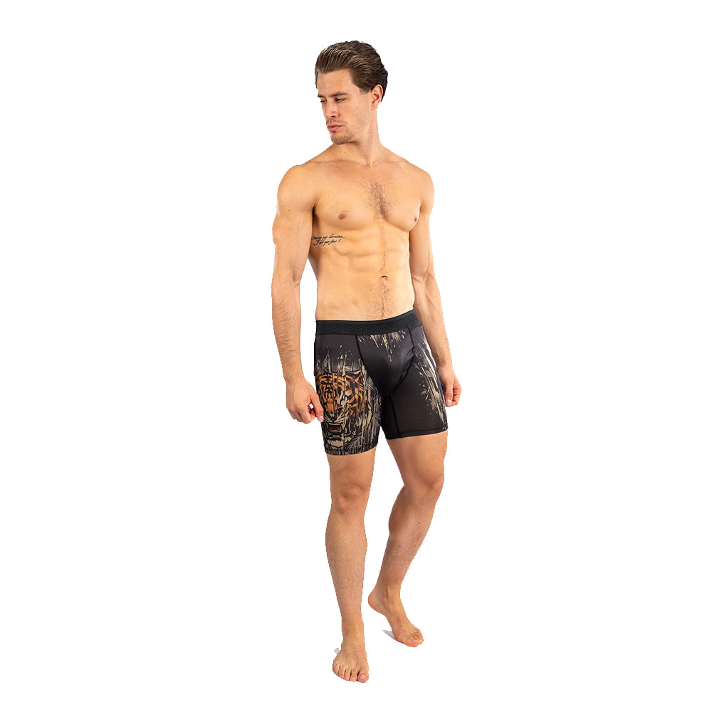 The striking design of the Venum Tiger Men’s Vale Tudo captures the unbounded ferocity of a wild cat, mid hunt. These are the perfect compression shorts for athletes with that savage edge. Wear them as-is or under fight shorts.